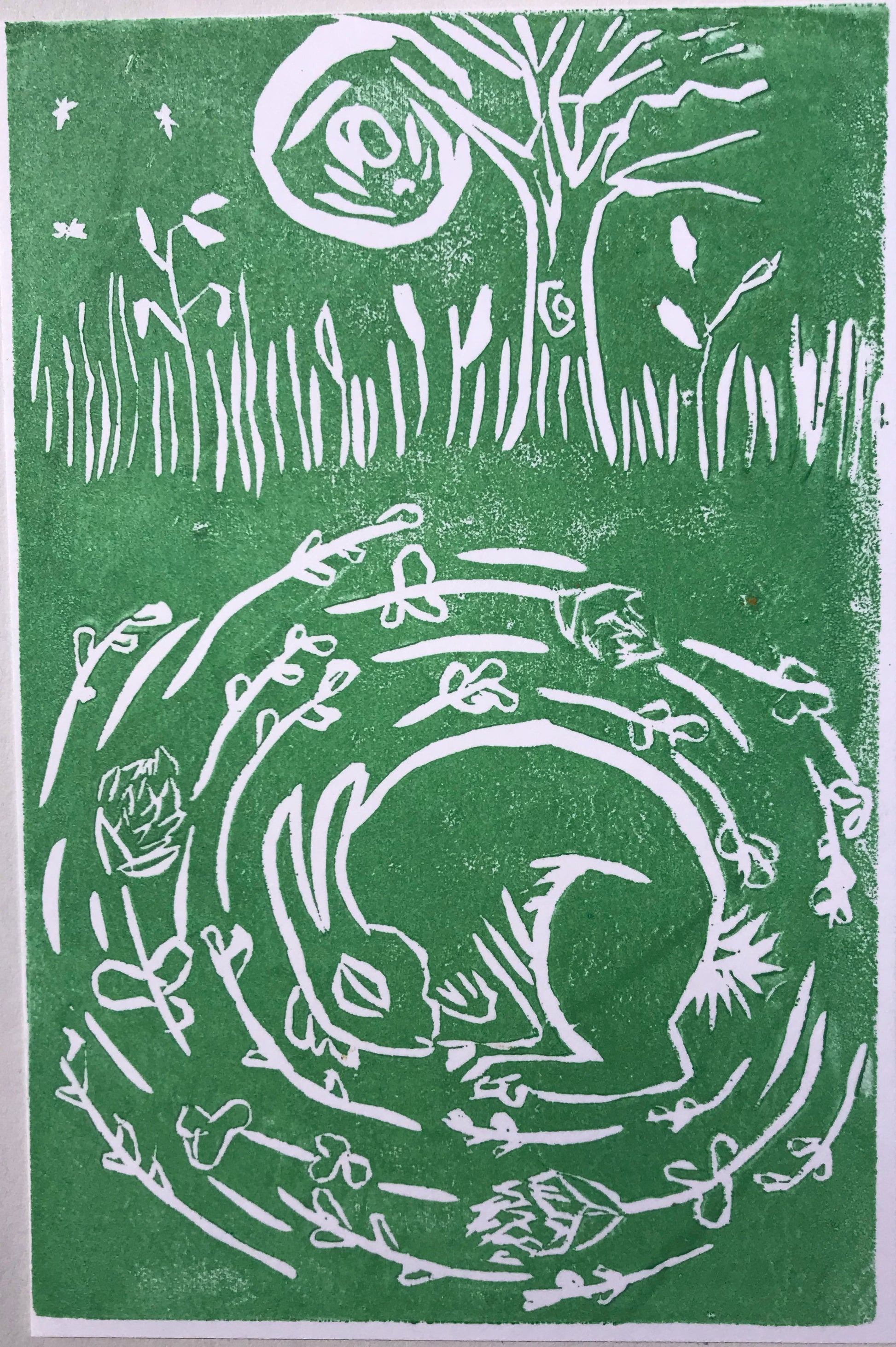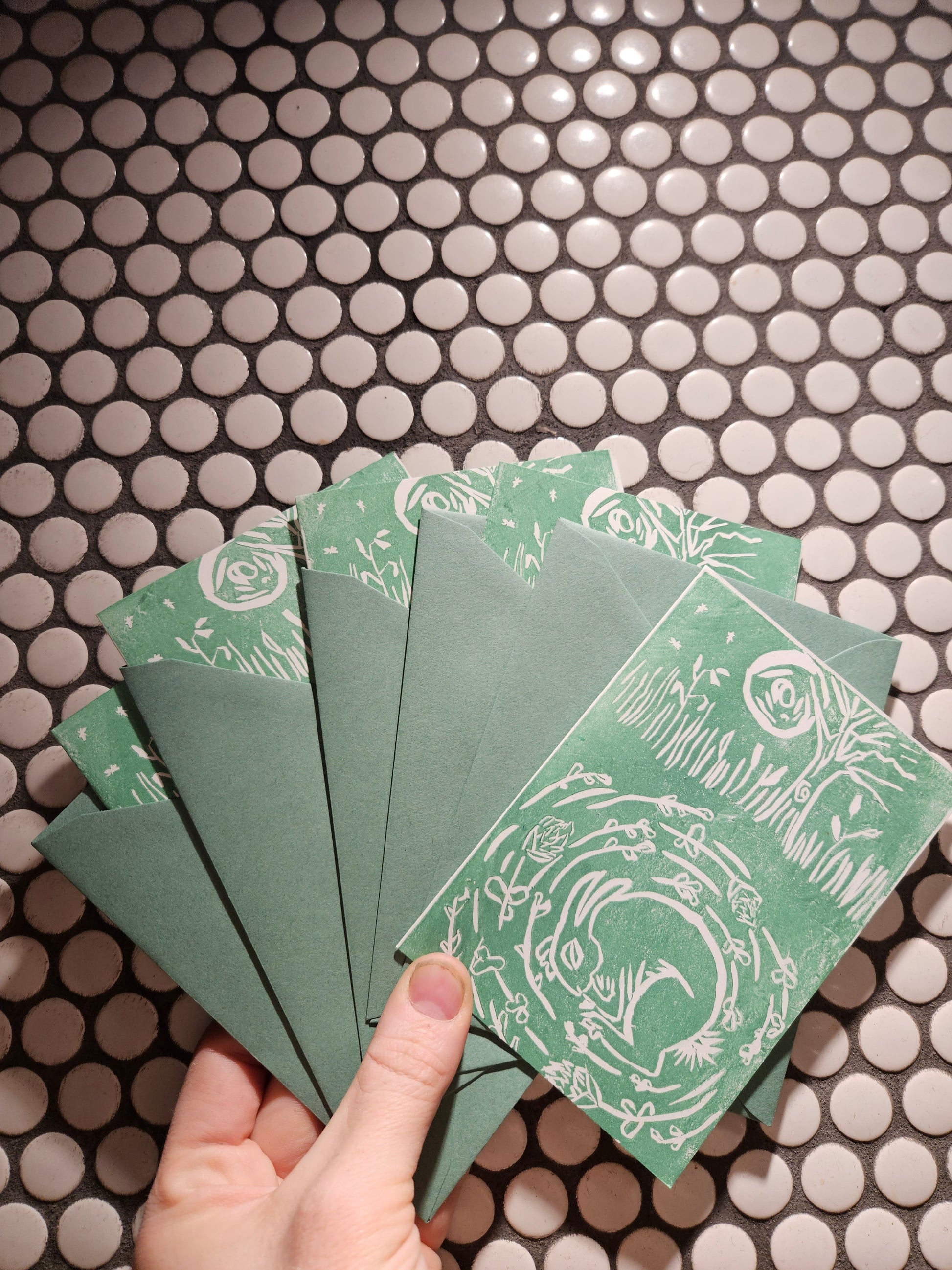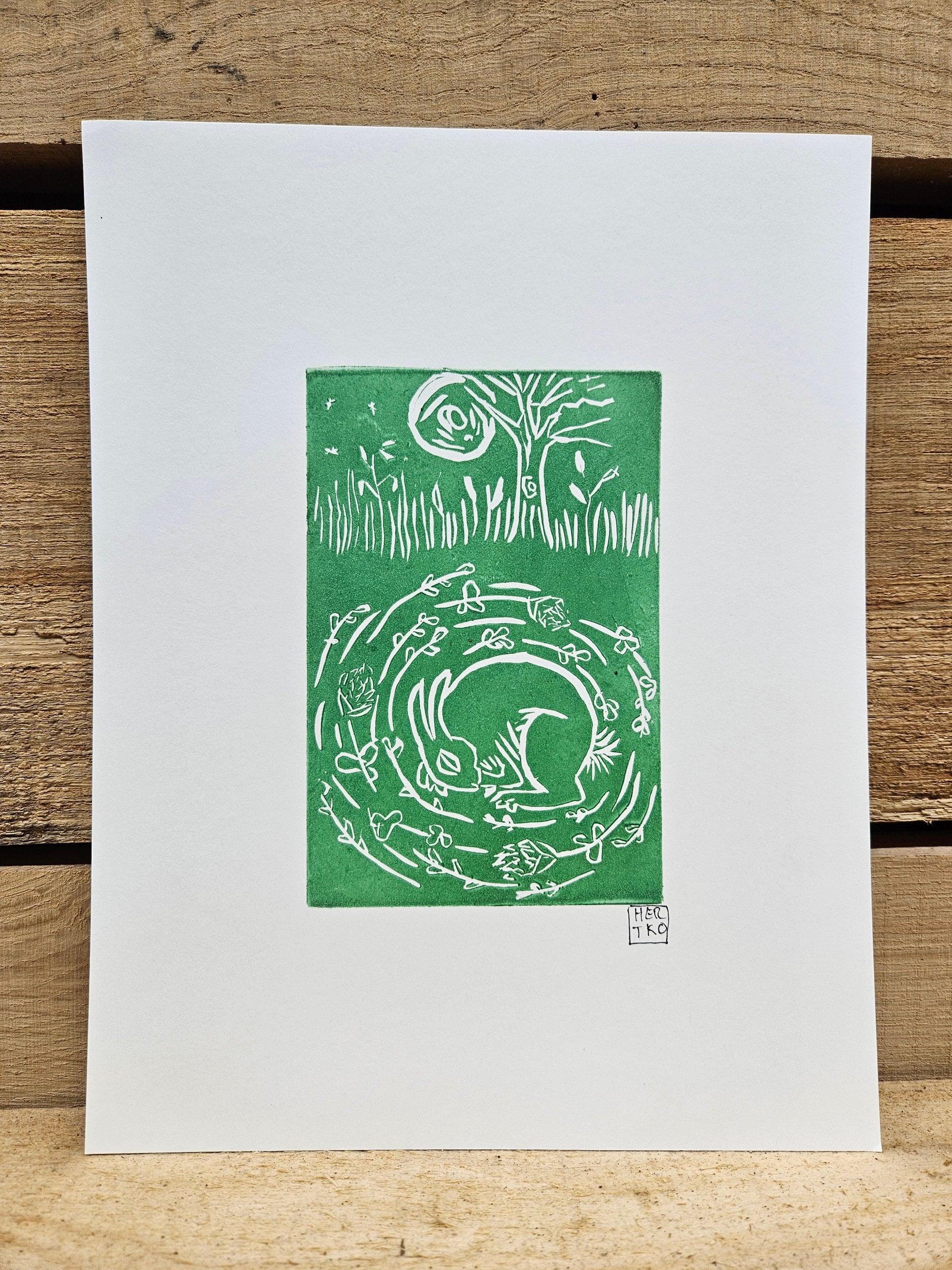 Hand printed Slumber postcard, print or greeting card with green A2 envelope.