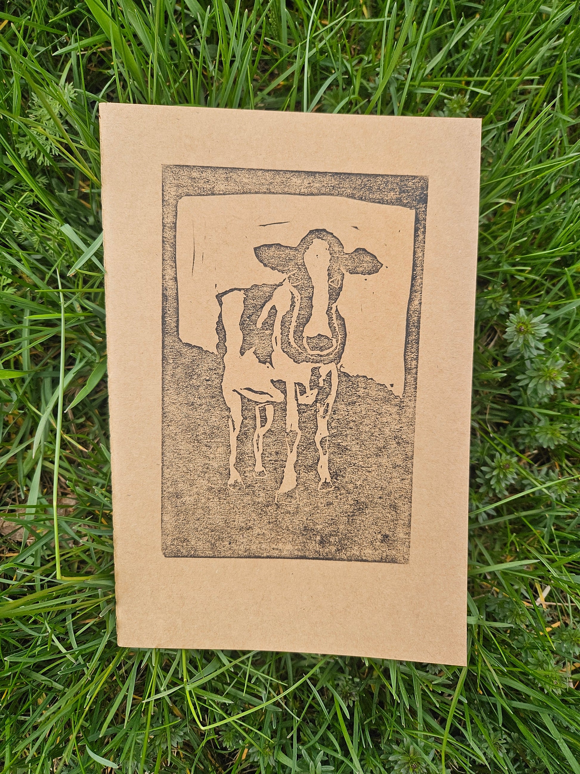 Hand printed cow greeting card (blank inside) or lined notebook. Optional curry or peacock envelopes.